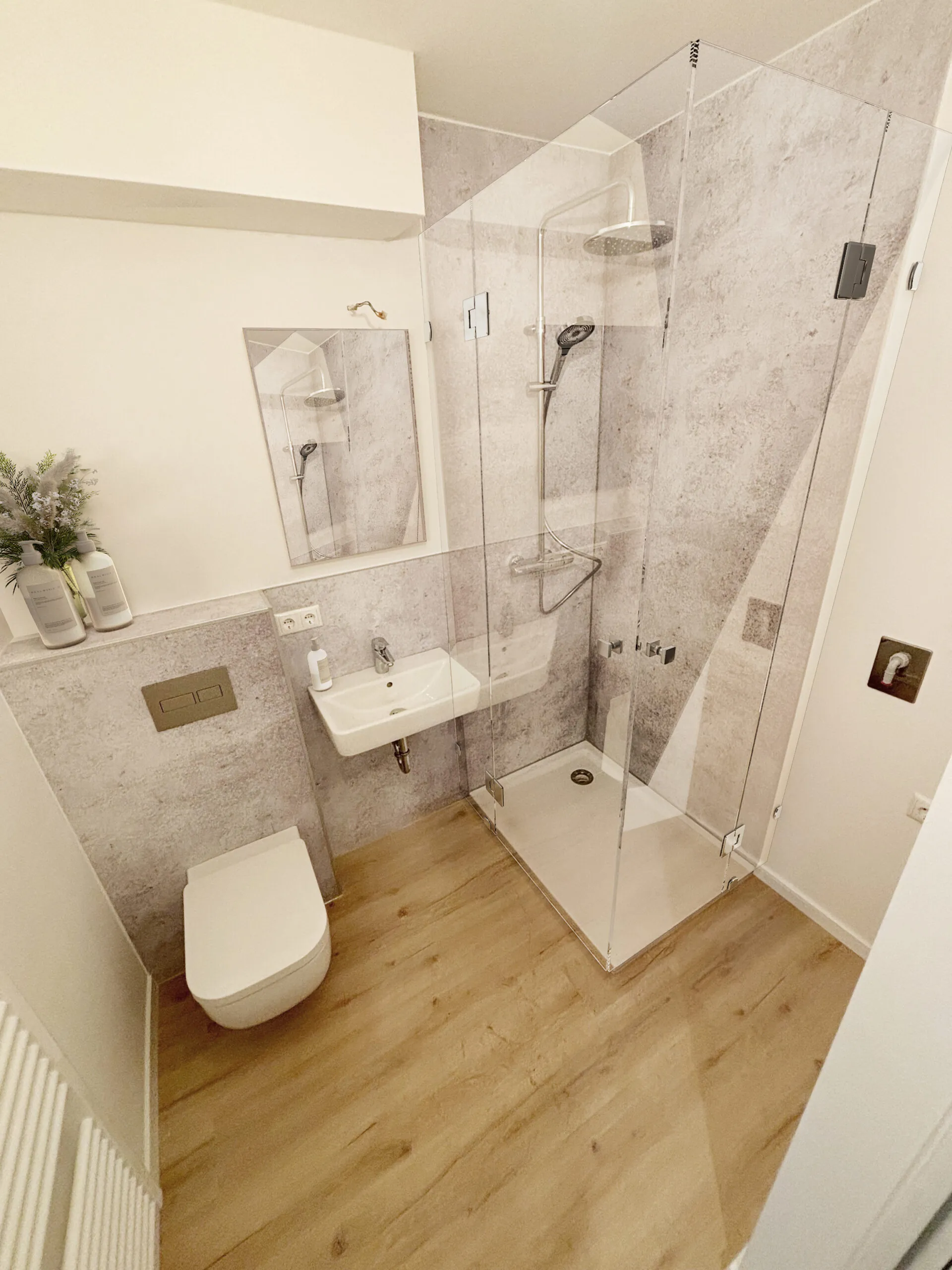-Modernes Badezimmer mit Fußbodenheizung, bodentiefer Dusche mit Regenfunktion, Hänge-WC, Waschtisch, Handtuchheizkörper und Waschmaschinenanschluss