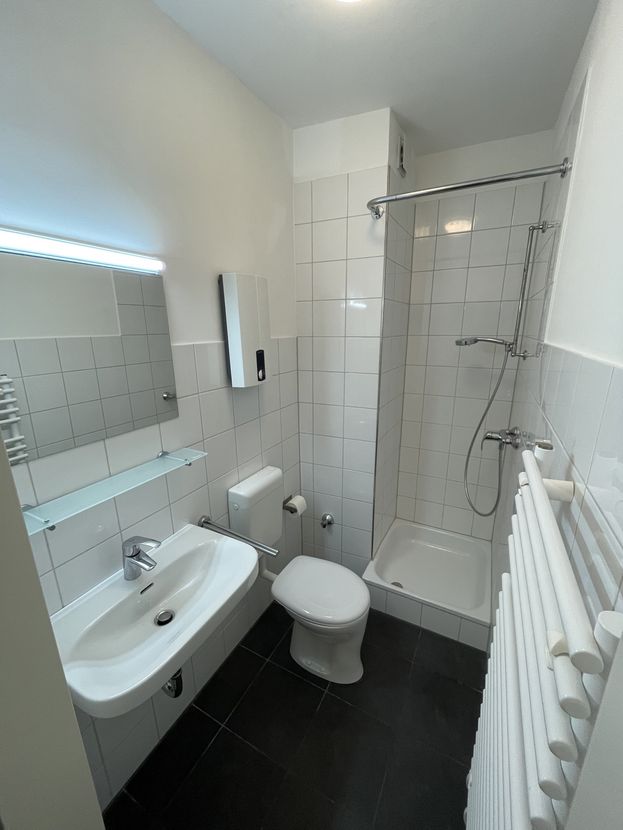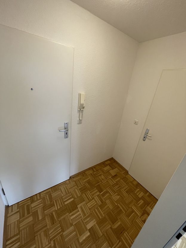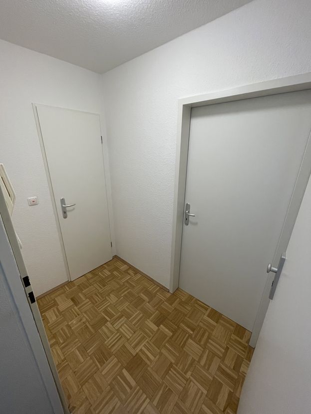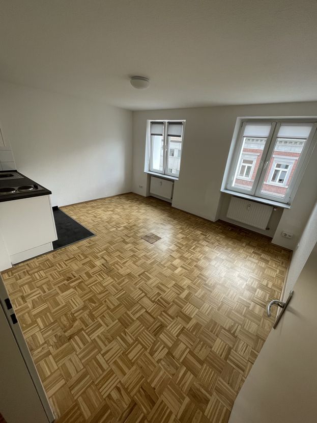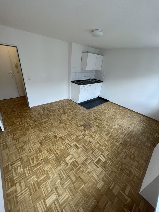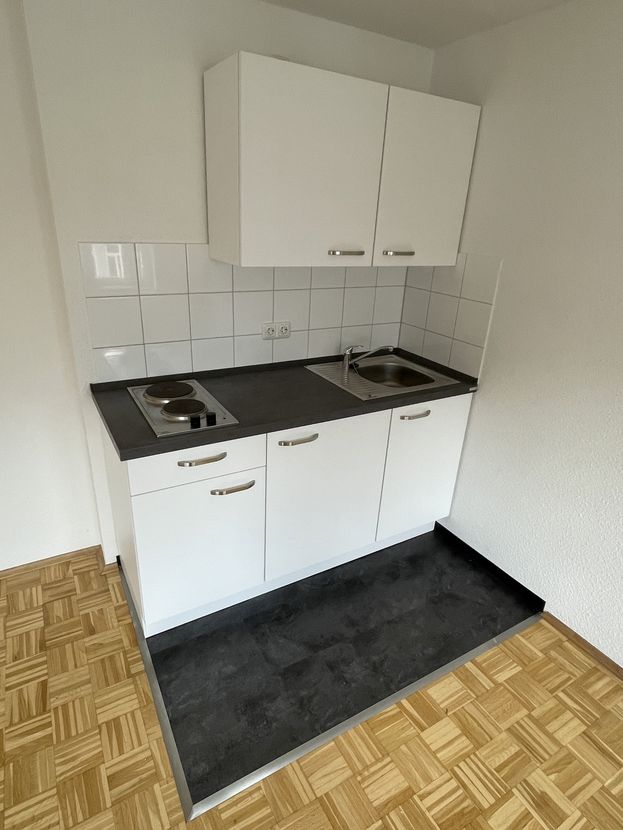 Die Wohnung ist mit einer Einbauküche ausgestattet. Die Einbauküche verfügt über Elektrogeräte, wie z.B. einen Kühlschrank und zwei Kochfelder. Das Badezimmer verfügt bereits über einen Spiegel.